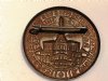 This pin is the tinnie for "Deutscher Reichskriegertag des Kyffhauserbundes Kassel Juli 6 - 8 1935". In English it translates to German Imperial Veterans' Day or Soldier's Day held on July 6-8, 1935, in Kassel, Hesse, Germany. The front shows the Kyffhauser monument in relief. Framed with Gothic script and a swastika on the bottom. The tinnie is made of stamped bronze-plated metal. Detail is very good for a tinnie. It measures 1 5/8" d (41.275 mm) and has the original fastening pin. A wonderful pre-WWII Nazi tinnie for your collection!