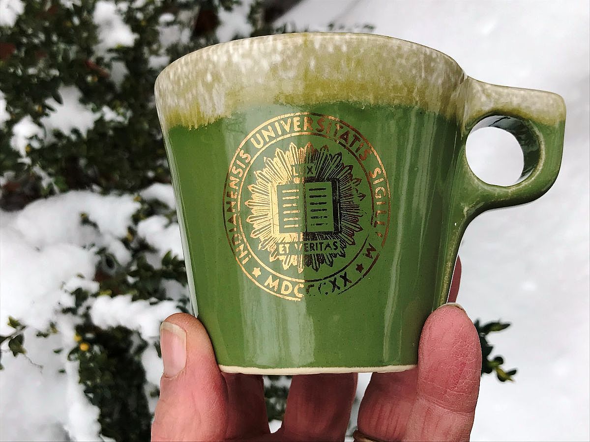 This vintage pottery mug was made by Hull Pottery circa 1970. It is the color "Avocado Drip" and has the seal of Indiana University, Bloomington, Indiana on it. It measures 3.5" h. A great gift item for your Indiana student or graduate!