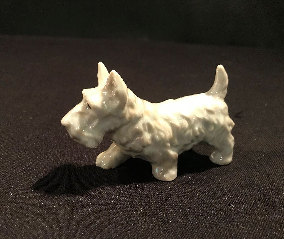 This vintage dog figurine was manufactured in Japan (stamped on belly) during the 1930's. It is made of white lusterware finish. The dog resembles a Scottie or Westie as they were popular due to FDR's Scottie Fala. The figurine measures 4" w x 1.5" d x 2 5/8" h. A nice addition to your collection!