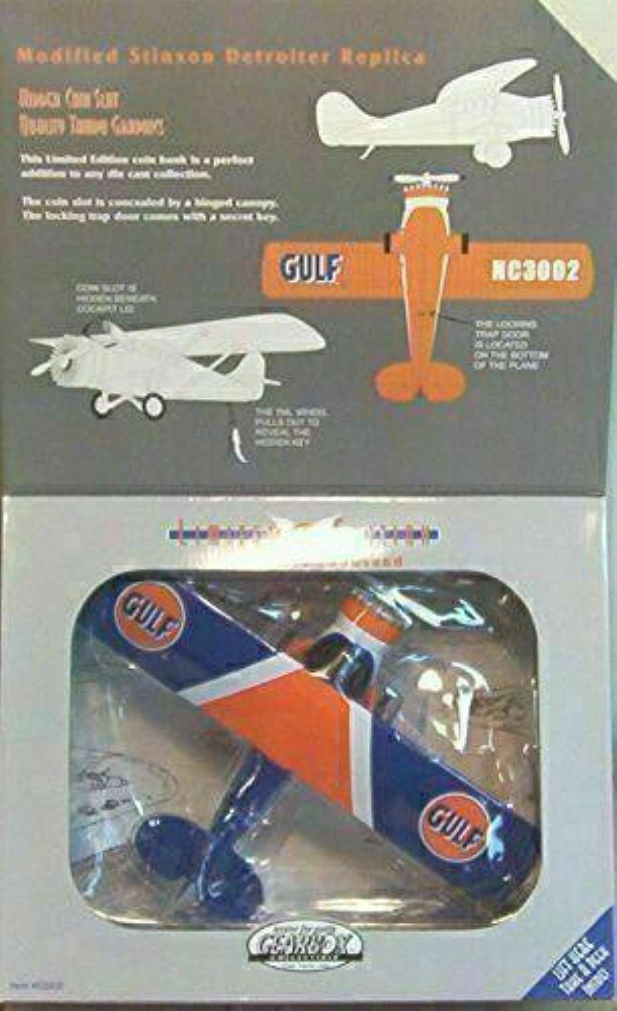 New in original factory box.The Gearbox STINSON DETROITER Gulf Oil Plane Bank is a unique and collectible toy designed in the shape of an airplane. Manufactured by Gearbox, this toy features intricate details and is branded as a Gulf Oil Plane. With a dedicated part number (4327777397) and ASIN (B000K798V0), this toy serves as both a plaything and a collectible item for enthusiasts of vintage vehicles and unique toys. Its distinctive design and branding make it a standout piece for collectors looking to add something special to their collection.