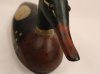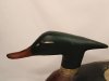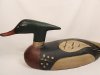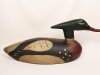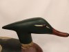 This is a newer decoy, meant for display, not hunting. It's 17 1/2 inches long, nearly the size of a real merganser. Across the breast it measures 5 1/2 inches and stands 7 1/4 inches tall to the top of its head. It weighs 2 pounds, 2 ounces and is solid wood. Stamped into the bottom are the initials WMW, which may stand for William M. Westfield, possibly a Pennsylvania or Ohio carver.