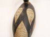 This long, heavy wooden decoy is a stylized red-breasted merganser, hand carved in an upright pose and hand painted in broad blocks of color. The drake duck's usual crest of shaggy head feathers is depicted in one long, pointed sweep. The head has tack eyes and a long, thin yellow/orange beak. There are two nails through the white neck band, one on each side. Feathers and speckles are painted on rather than carved.